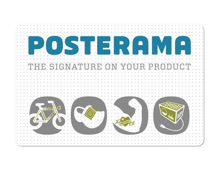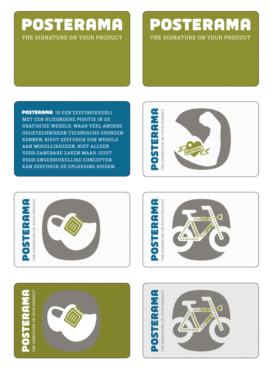 Voor Posterama, een zeer gespecialiseerde drukkerij in transfers, ontwikkelde de studio een huisstijl. De iconen werden gemaakt door Pieter van Rosmalen.