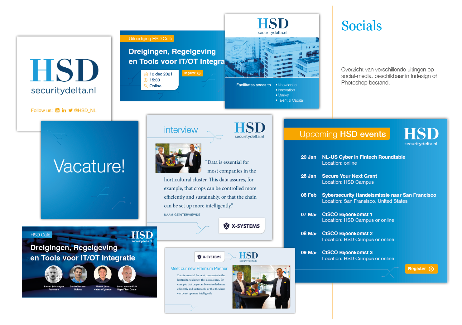 Voor Security Delta maakte ik een nieuwe huisstijl en logofamilie. Vervolgens de implementatie van huisstijlmiddelen, templates en social media designs.