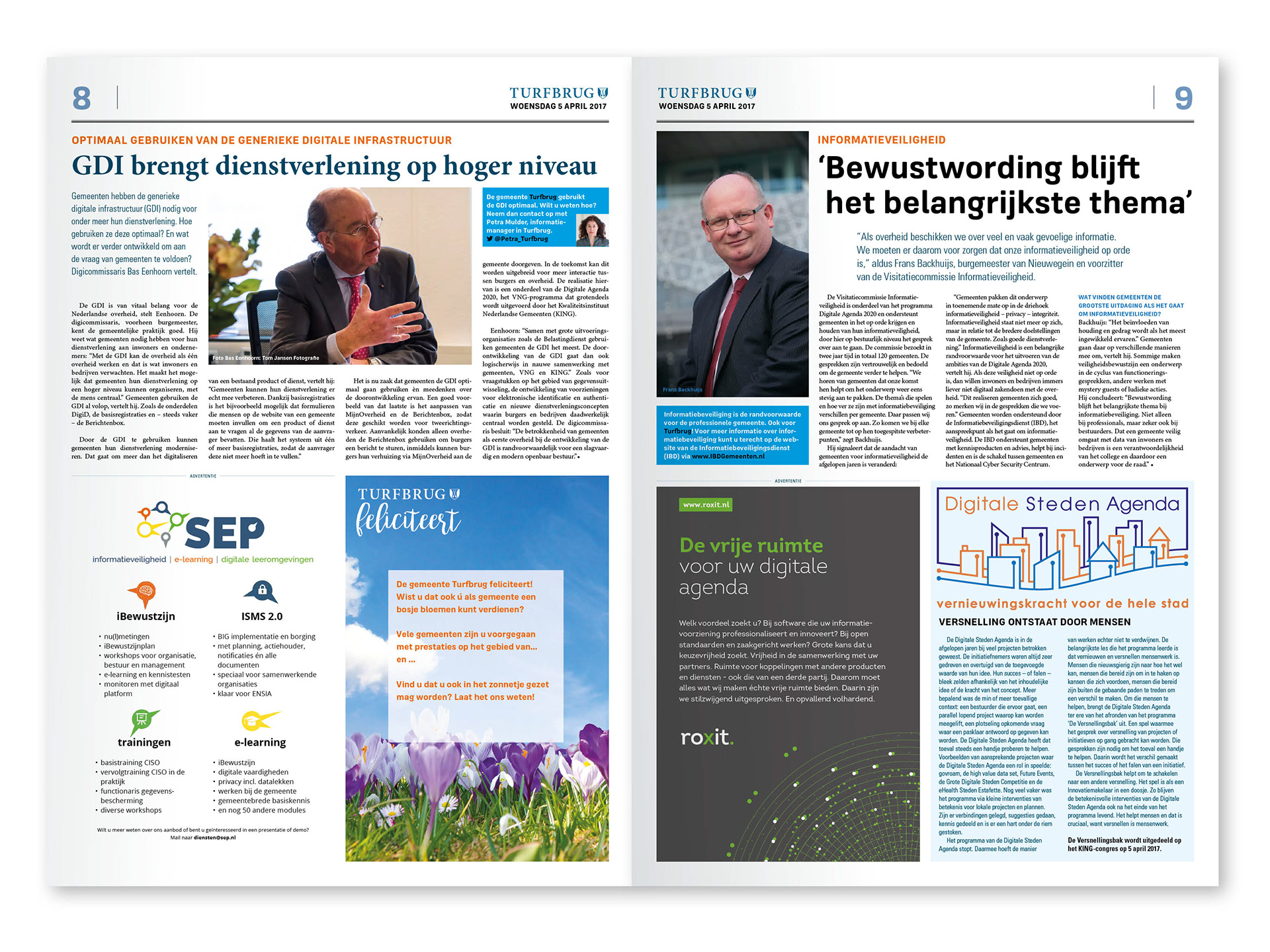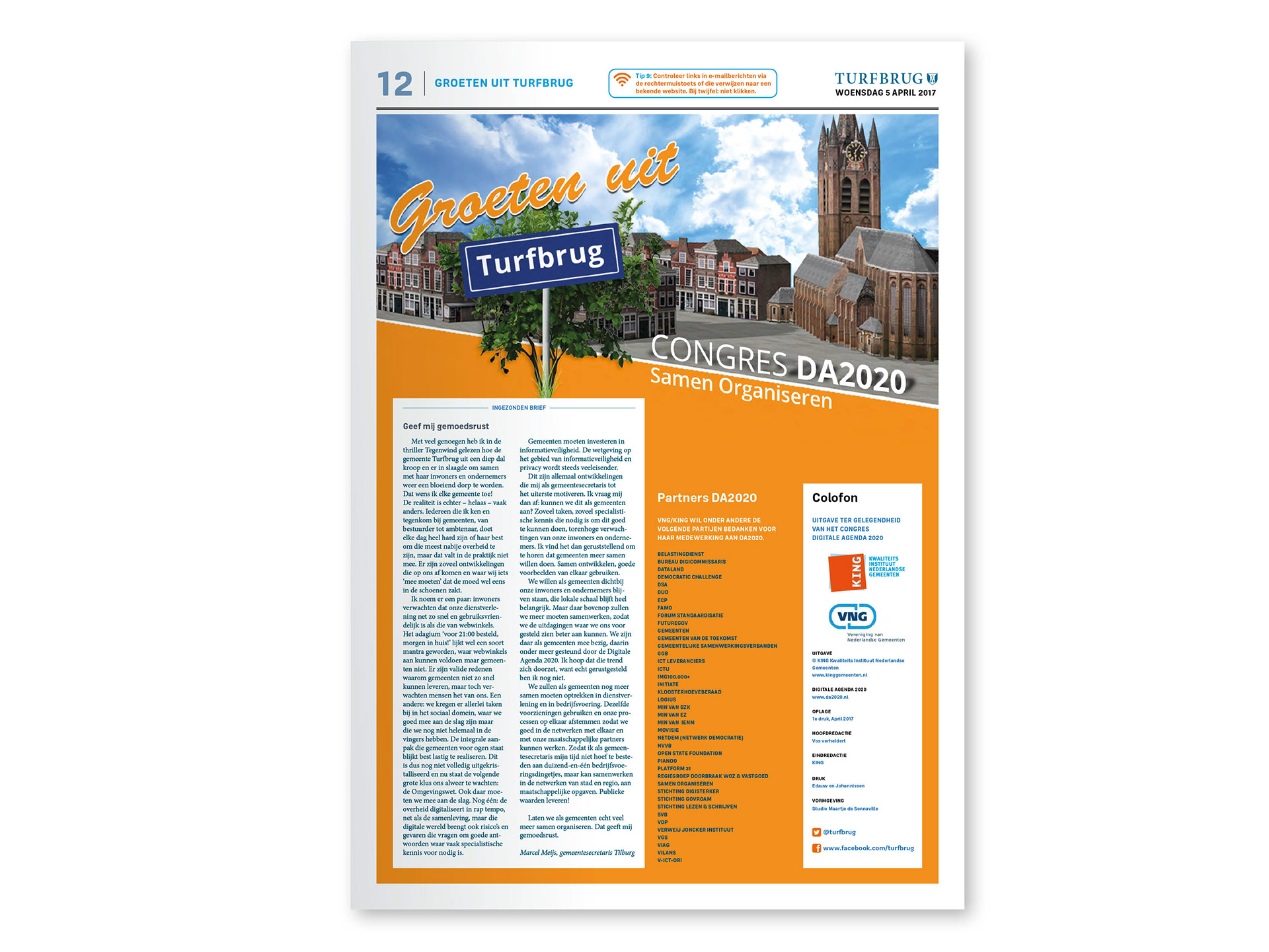 Naar aanleiding van het boek Tegenwind werd een decor vormgegeven voor een congres waarin de denkbeeldige gemeente Turfbrug tot leven kwam. Ik ontwierp verschillende middelen voor het congres, zoals ook de Turfburg Courant.